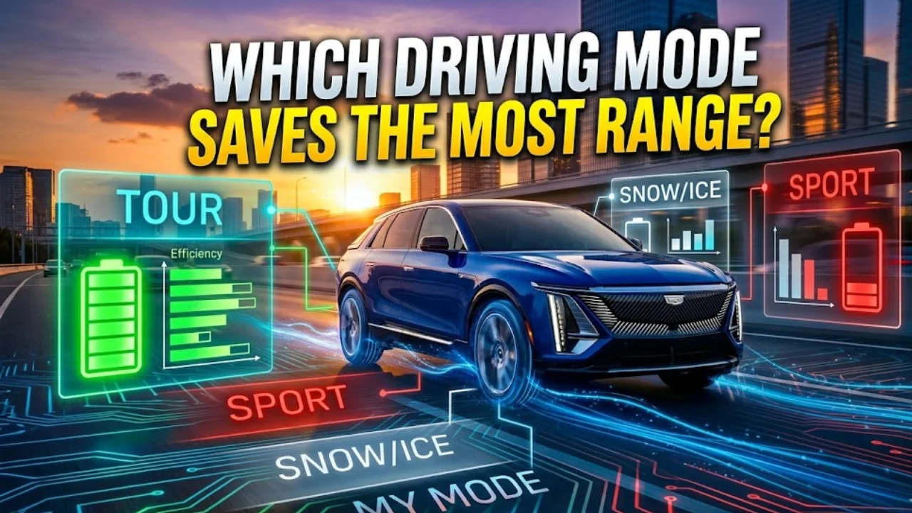 es. Each mode changes how the Lyriq pulls power from its Ultium battery. Tour Mode is the most efficient. Sport Mode reduces range by roughly 10–15%. Snow Mode has minimal impact.